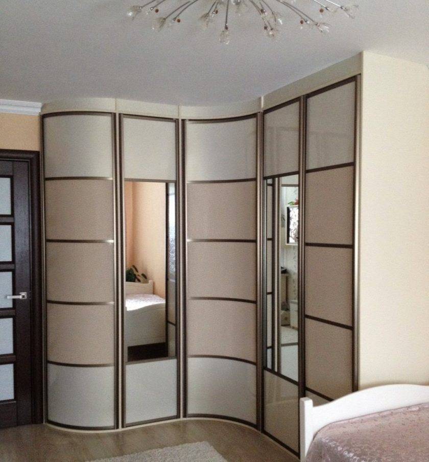 Радиусные угловые шкафы отличаются особой привлекательностью. Они состоят из таких основных элементов, как фасад, корпус, раздвижная система, внутренне наполнение и декор. При их изготовлении используют различные отделочные материалы, но чаще всего в мебельном производстве применяют: