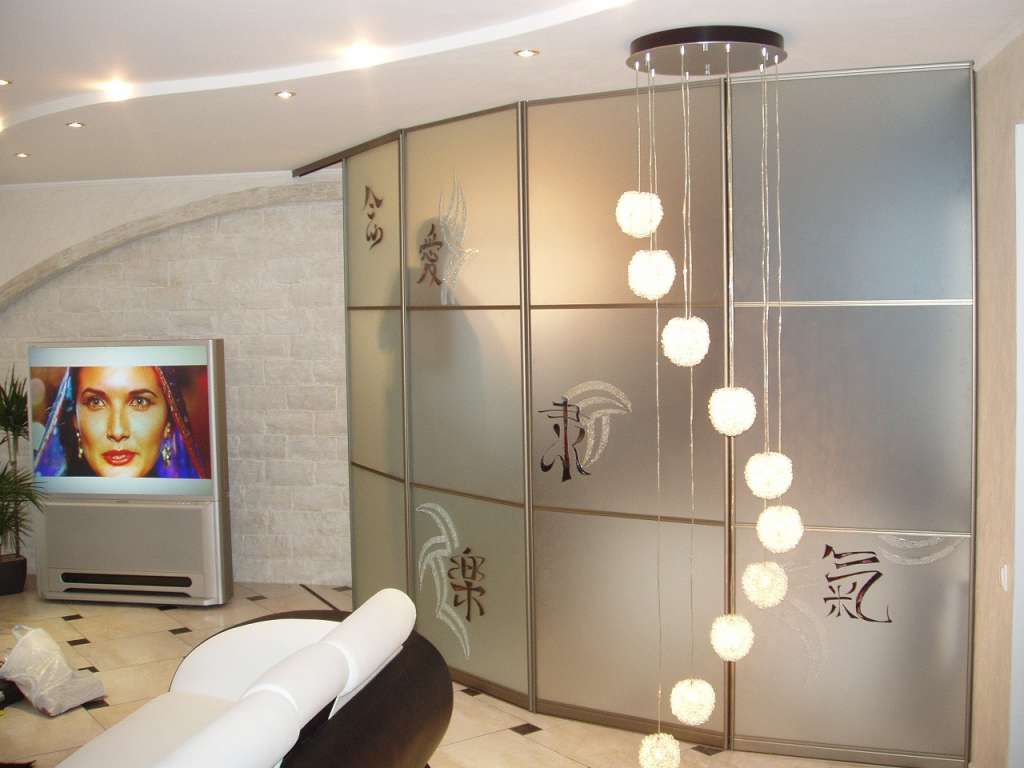 Фьюзинг напоминает мозаику, кусочки цветного стекла оплавляют при высокой температуре (до 1000 градусов). Им придают определенную форму. Затем приклеивают на поверхность радиусных шкафов. Такой дверью можно красить любое помещение. Существуют специальные краски, которые потом застывают и крепко держатся на фасаде. Для разных поверхностей предназначены определенные виды красок. Еще один способ декора — комбинация разных материалов. К примеру, вставка из стекла, кожи, текстурных тканей и так далее.