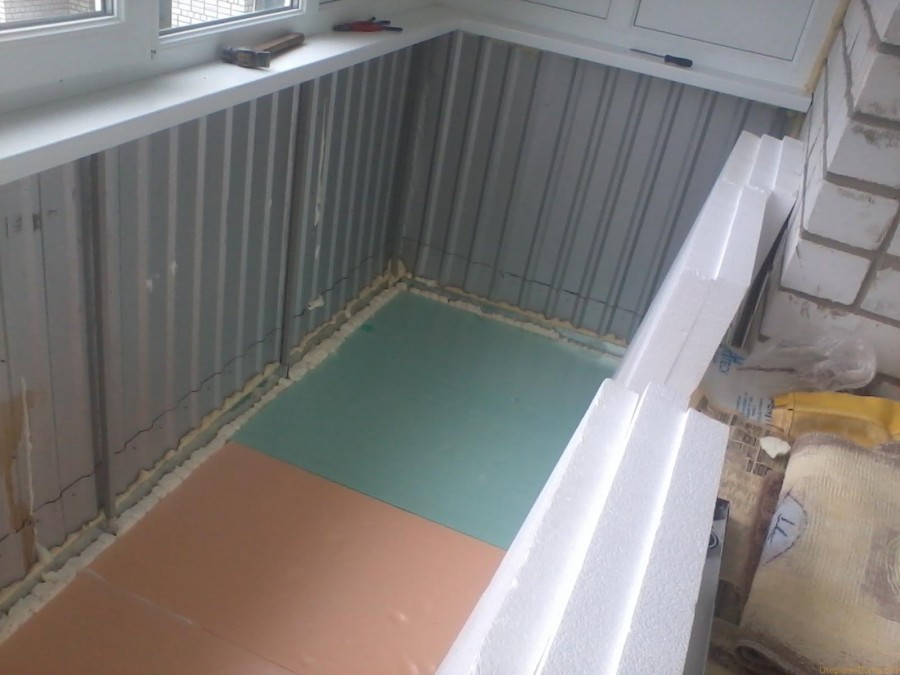 - для лучшей сохранности тепла на балконе или лоджии необходимо создать своеобразные «бутерброды» из утеплителя и пенопласта: нижний слой – изолон толщиной в 5 мм фольгой внутрь, потом пенопласт нужной толщины и снова изолон, но уже 3 мм толщины фольгированой стороной внутрь;