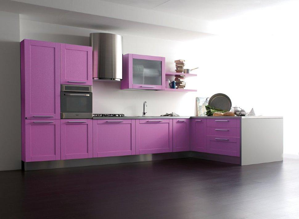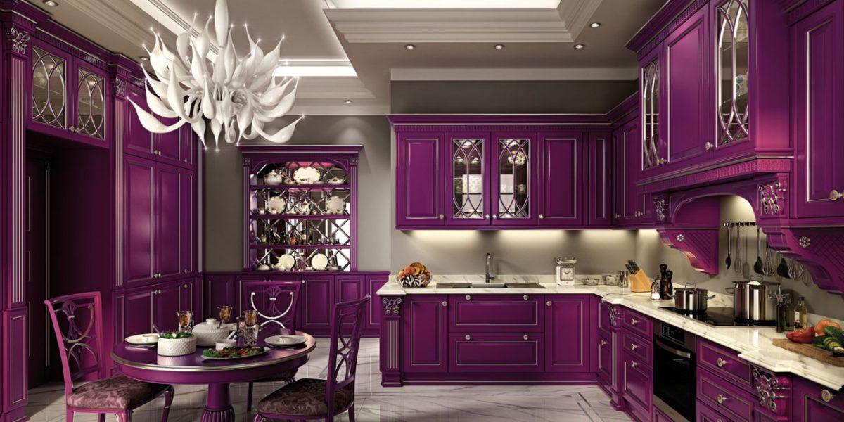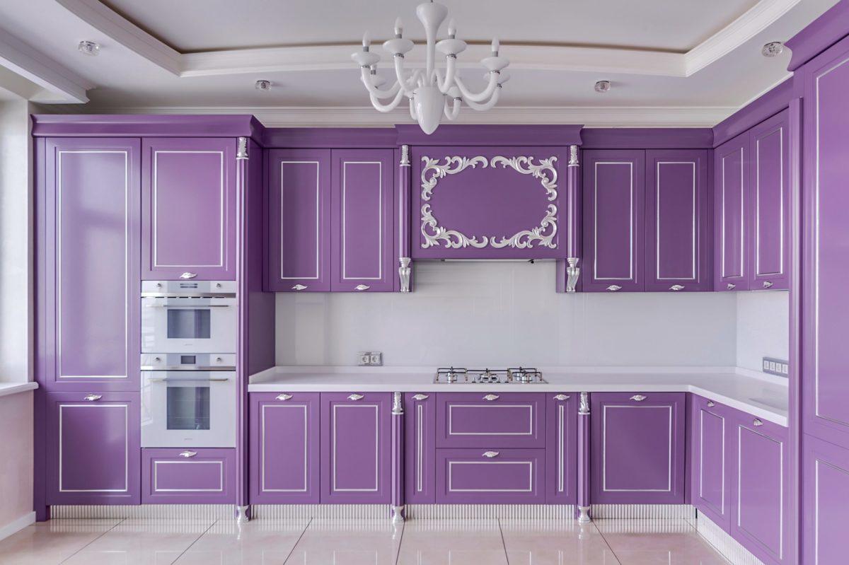 получится очень интересной с фиолетовым кухонным гарнитуром. Желательно, чтобы он был матовым, с витиеватыми резными фасадами, тяжёлыми распашными дверцами. Если кухня просторная, для неё подойдут все оттенки фиолетового.
