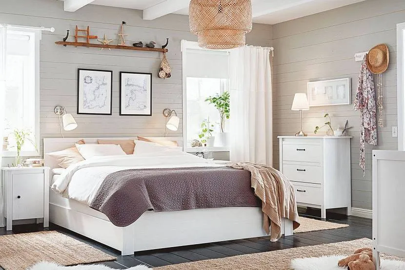 Сделать обычную спальню уютной поможет текстиль и аксессуары. Плотные шторы выбирайте в тон обоев или вовсе замените на прозрачные тюли, откажитесь от рисунка на ткани — декорировать окна лучше однотонными. Вешать их следует от потолка до пола.