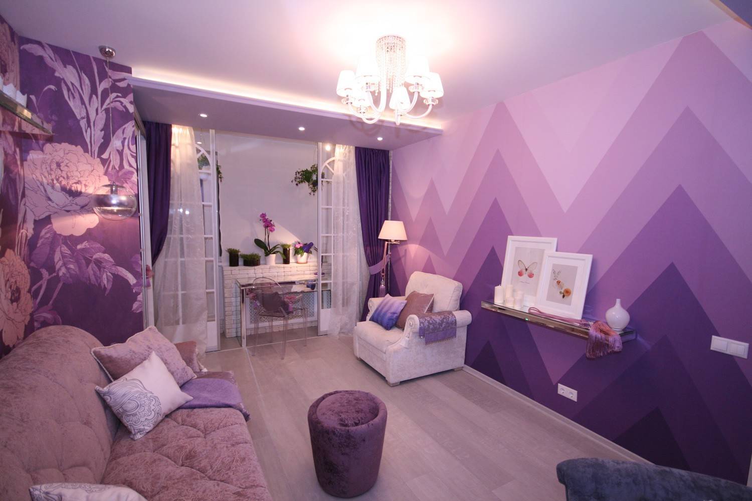Неординарно будет выглядеть лиловый цвет в отделке зала. Оттенки сиреневой гаммы довольно своеобразны и неоднозначны. Они включают в себя широкий спектр других чистых цветов, что и создает многообразие вариаций и нюансов подобного колера. Например, преобладание ноток в фиолетовом диапазоне сделает интерьер таинственным, содержательным. В гостиной в лиловых тонах вряд ли будет находиться дополнительная зона в виде детской или игровой территории. Такая комната чаще используется для приема гостей и времяпрепровождения семейной пары без детей.