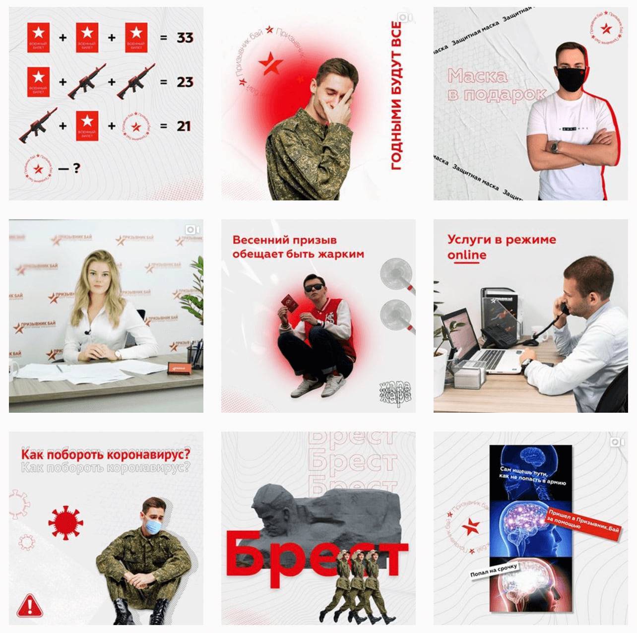 Берите пример с Центра помощи призывникам Prizivnik.by. Они используют серый фон с красными надписями в своих эфирах, а также на обычных постах. Фото клиентов интегрируются в красивый дизайн Инстаграм-коллажей и закрепляются результат единым решением в плане шрифтов, цветов и декоративных элементов.