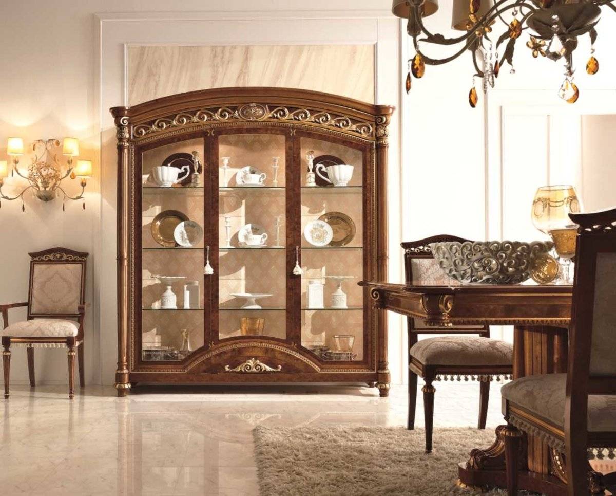 Шкаф витрина для гостиной в классическом стиле – это образец роскоши, он хорошо подчеркнёт помпезность зала, своим величественным видом. Такие изделия изготавливают из дорогих пород дерева, украшают богатой отделкой и позолоченной фурнитурой.
