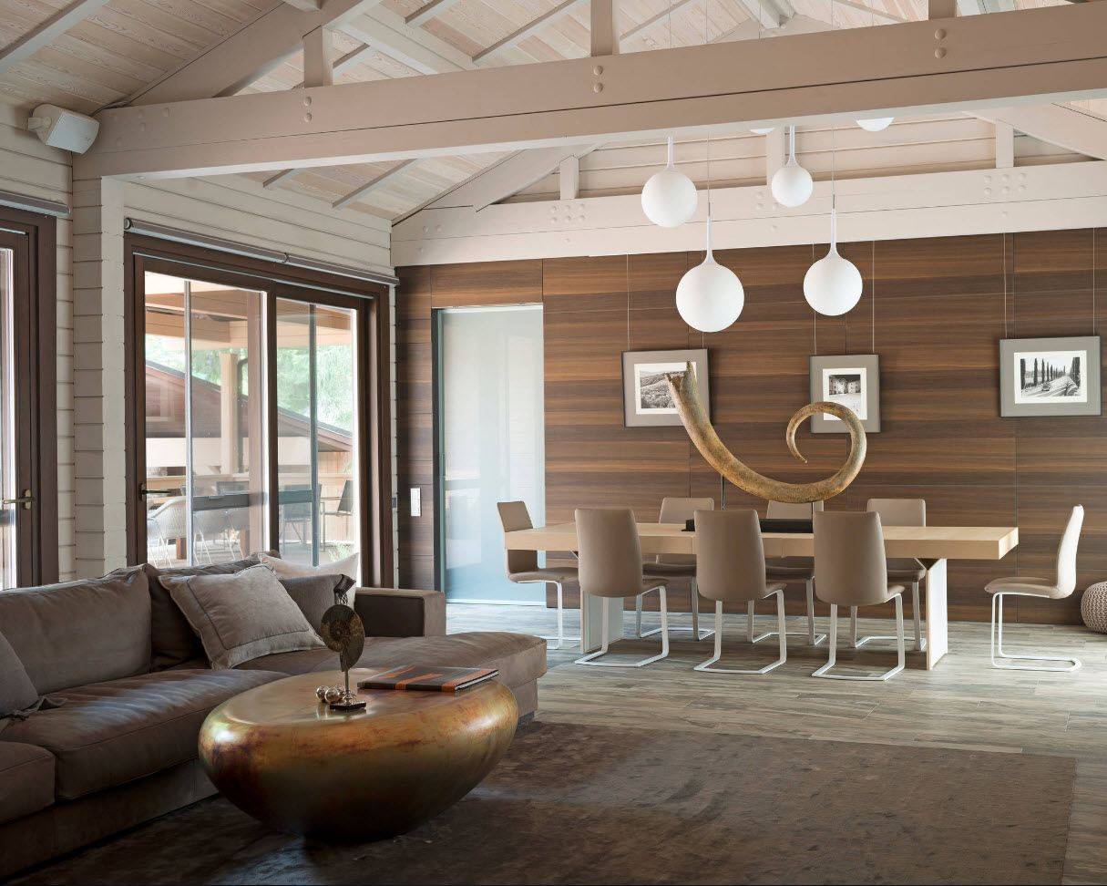 В первом случае панелями обшивается вся площадь потолка и стен с соблюдением всех технологий. Во втором варианте осуществляется частичная обработка древесиной, сочетание имитации бруса с текстилем, обоями, стеклом.