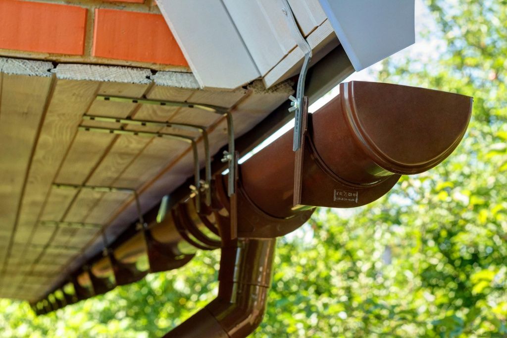 Монтаж + водостоки пластиковые на стропильной конструкции лучше всего сделать так: прикрепить кронштейны на конструкцию стропильной системы к каждой кобылке специальными саморезами. Проще всего это сделать при помощи обычной дрели.