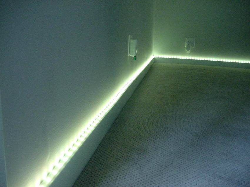 При оформлении интерьера используются точечные светильники, светодиодные шнуры и ленты. Шнур имеет цилиндрическую форму и освещает на все 360 градусов. Лента же плоская, с одной стороны ее поверхность клейкая (что упрощает монтаж), с другой расположены светодиоды. В квартирах и коттеджах чаще используются ленты, так как редко появляется необходимость всестороннего освещения.