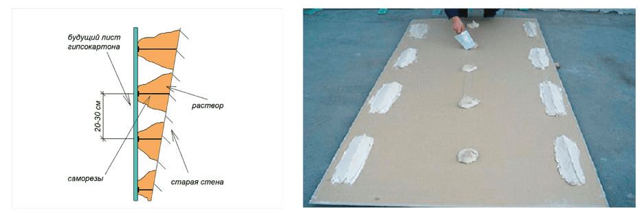 В этом случае оборотная сторона листа покрывается «лепешками» клея. В процессе прижима излишки состава заполнят имеющиеся пустоты, чем и обеспечится более качественное крепление гипсокартона на основе.