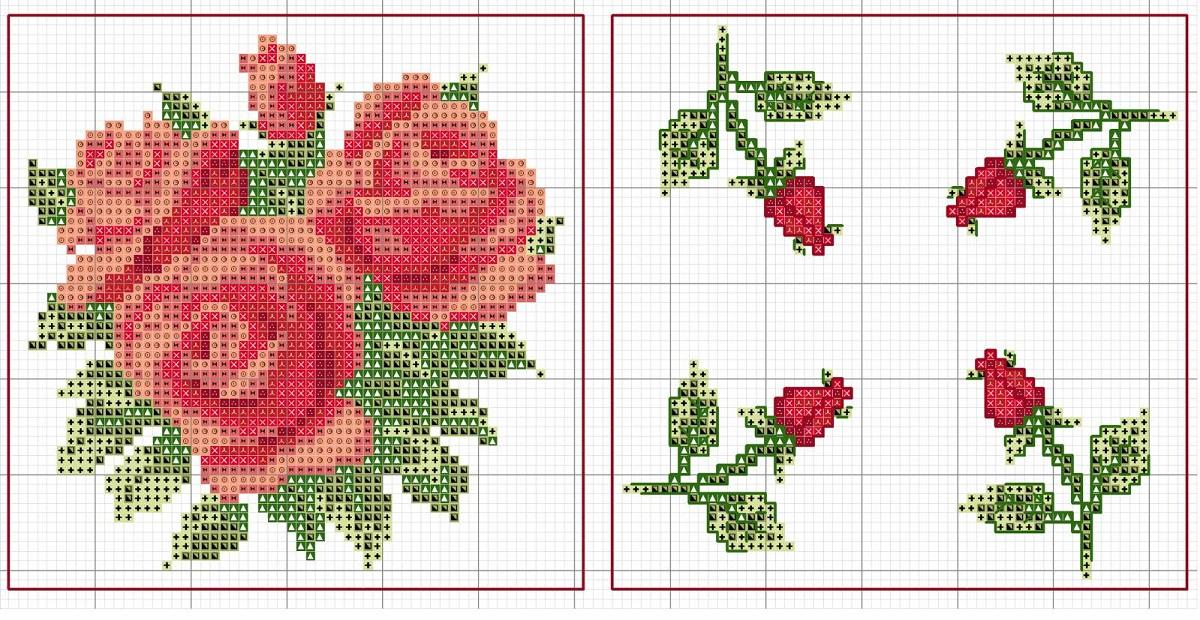 Большинство схем для вышивания розы предусматривают использование ниток красного и зеленого цвета