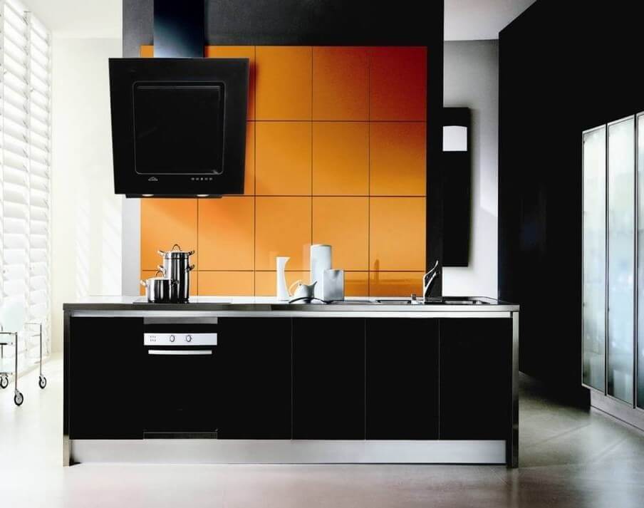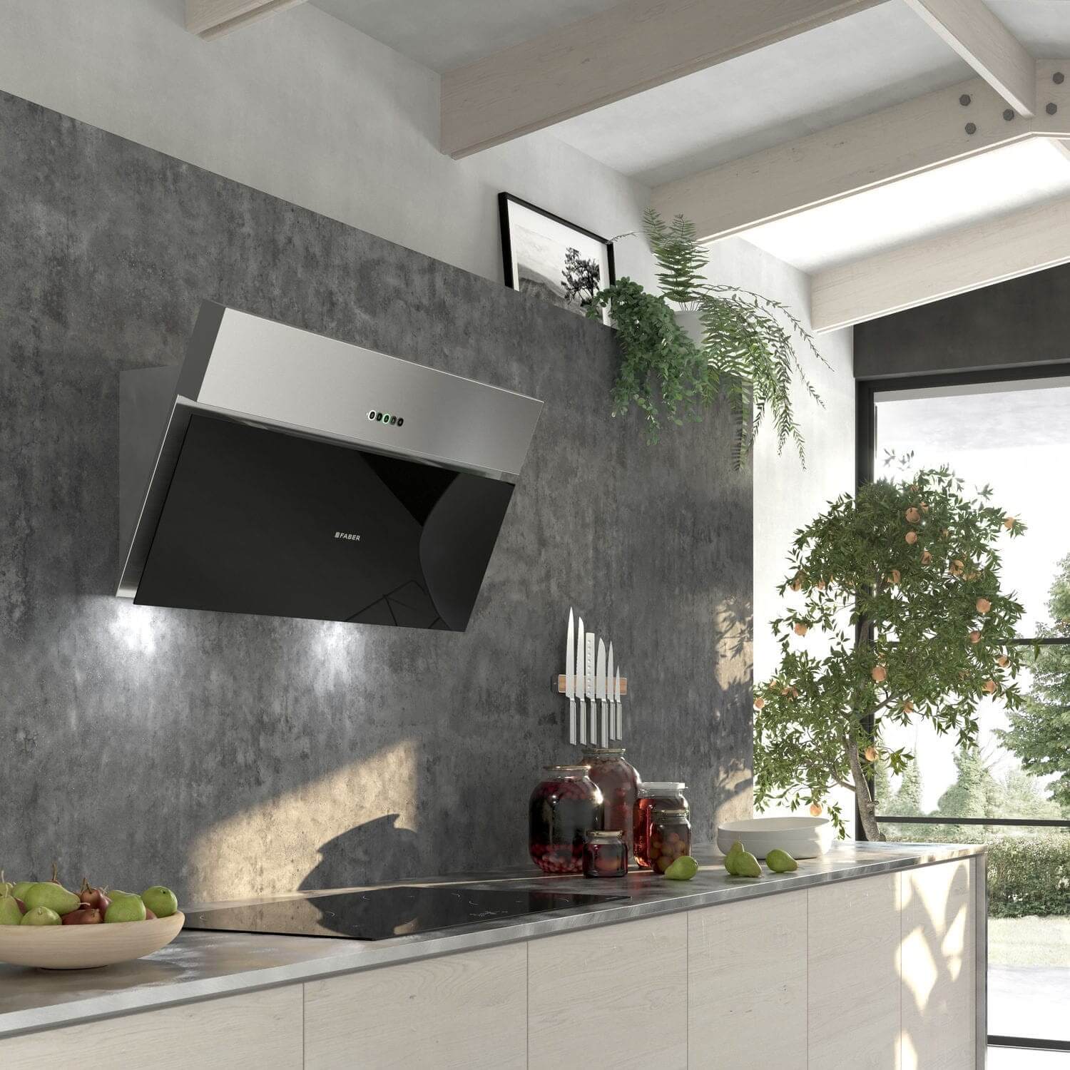 Чёрная наклонная вытяжка выигрышно смотрится на любом контрастном фоне. Elikor
