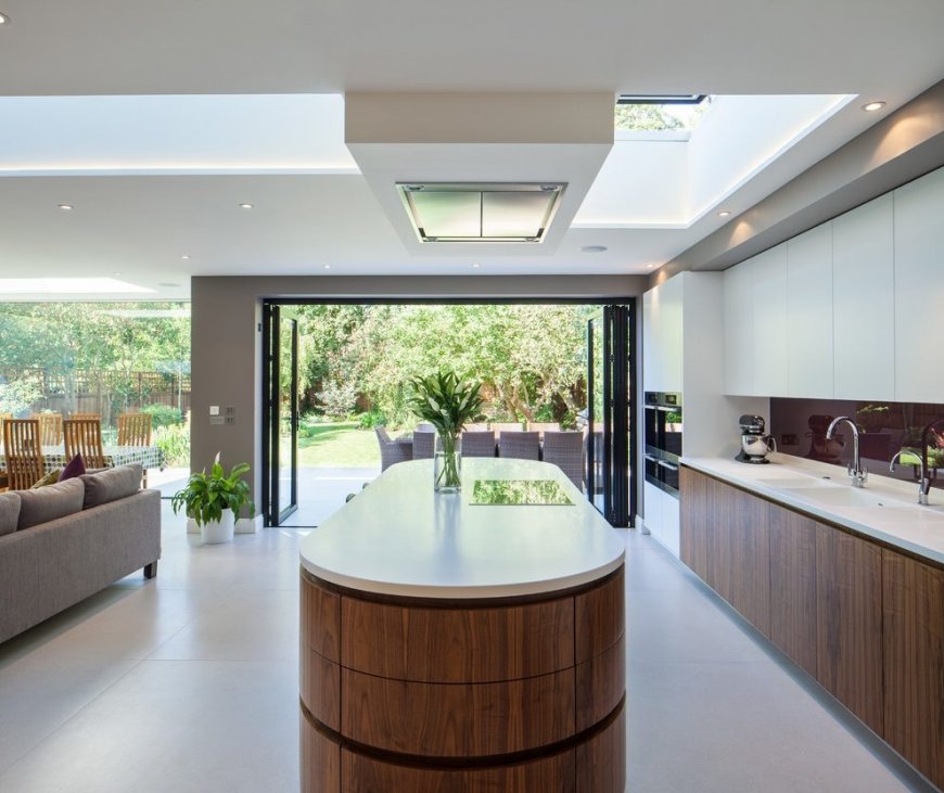 Островная вытяжка (или просто «островок») – крепится к потолку ровно над плитой. Подходит для домов с высокими потолками, но в этом случае оборудование придется покупать более мощное;
