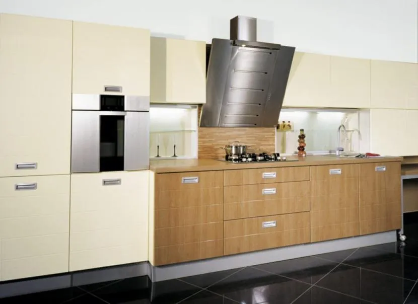 Самые проблемные участки для маскировки любого канала – вертикальные. Особенно тот, что идет от отверстия вытяжки до верха шкафов. Для решения этой задачи нет ничего лучше, как выбрать встраиваемую вытяжку для кухни и скрыть трубу за фасадами навесного модуля.