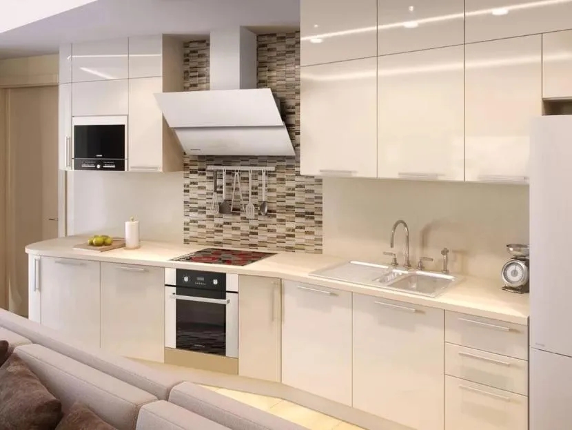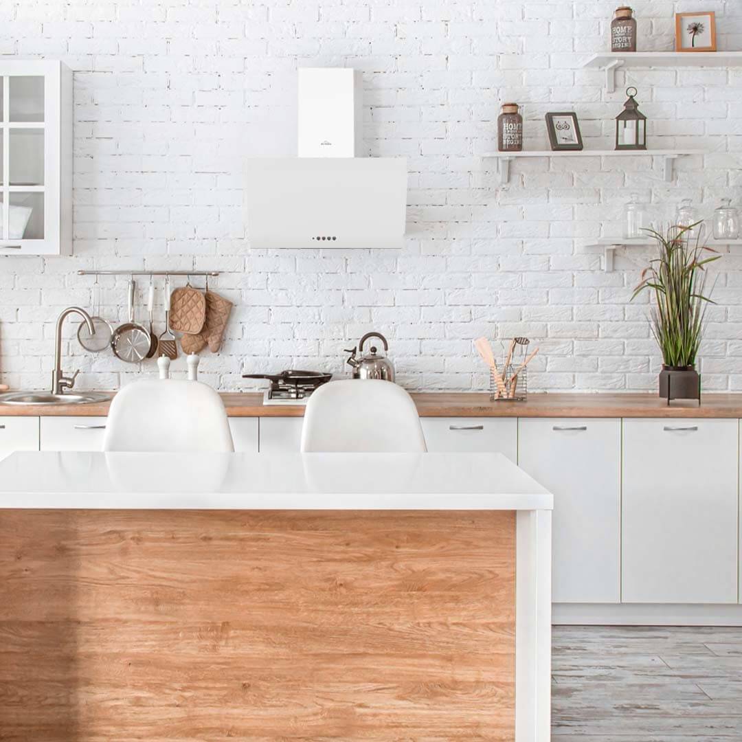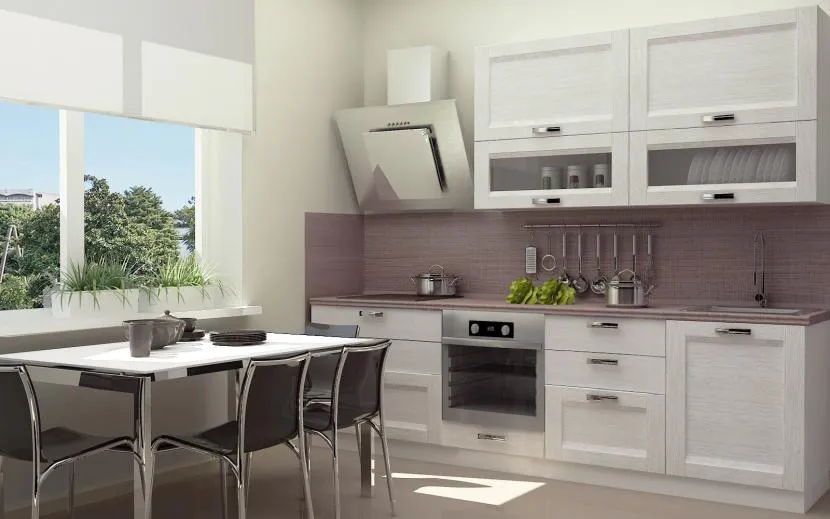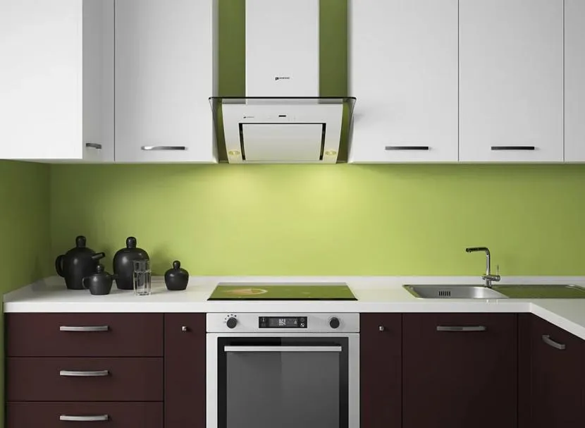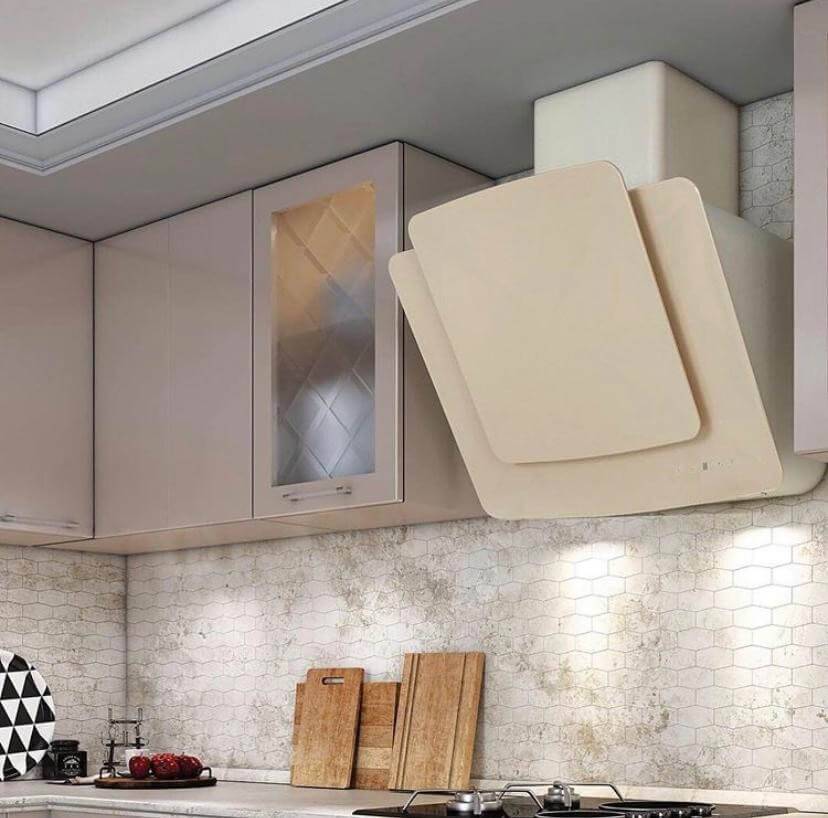 Светлые наклонные вытяжки. На светлой кухне чёрная бытовая техника может выглядеть неуместно. В таком случае хорошим решением будет выбор в пользу вытяжек белого или мягкого бежевого цветов, в тон кухонному гарнитуру.