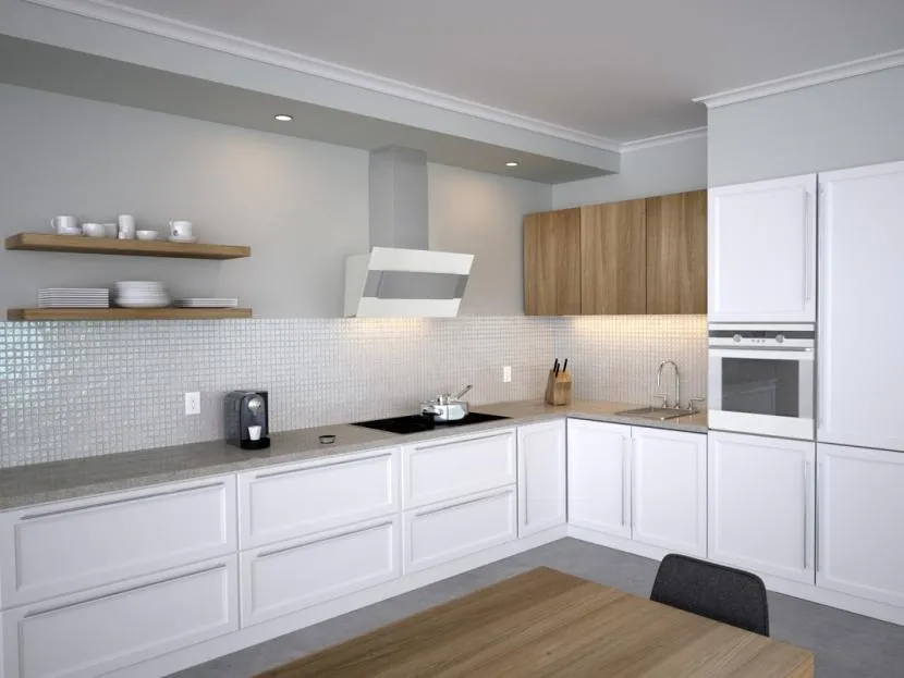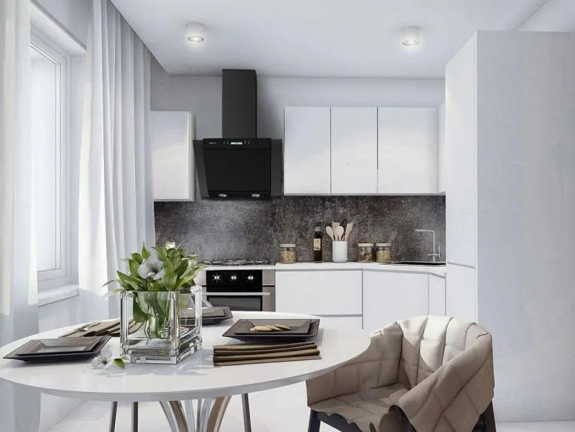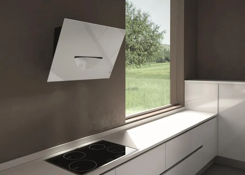 Белая наклонная вытяжка в цвет фасадов и стен становится практически незаметной. Elikor