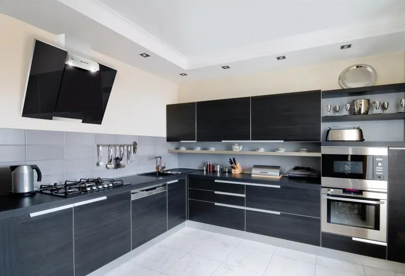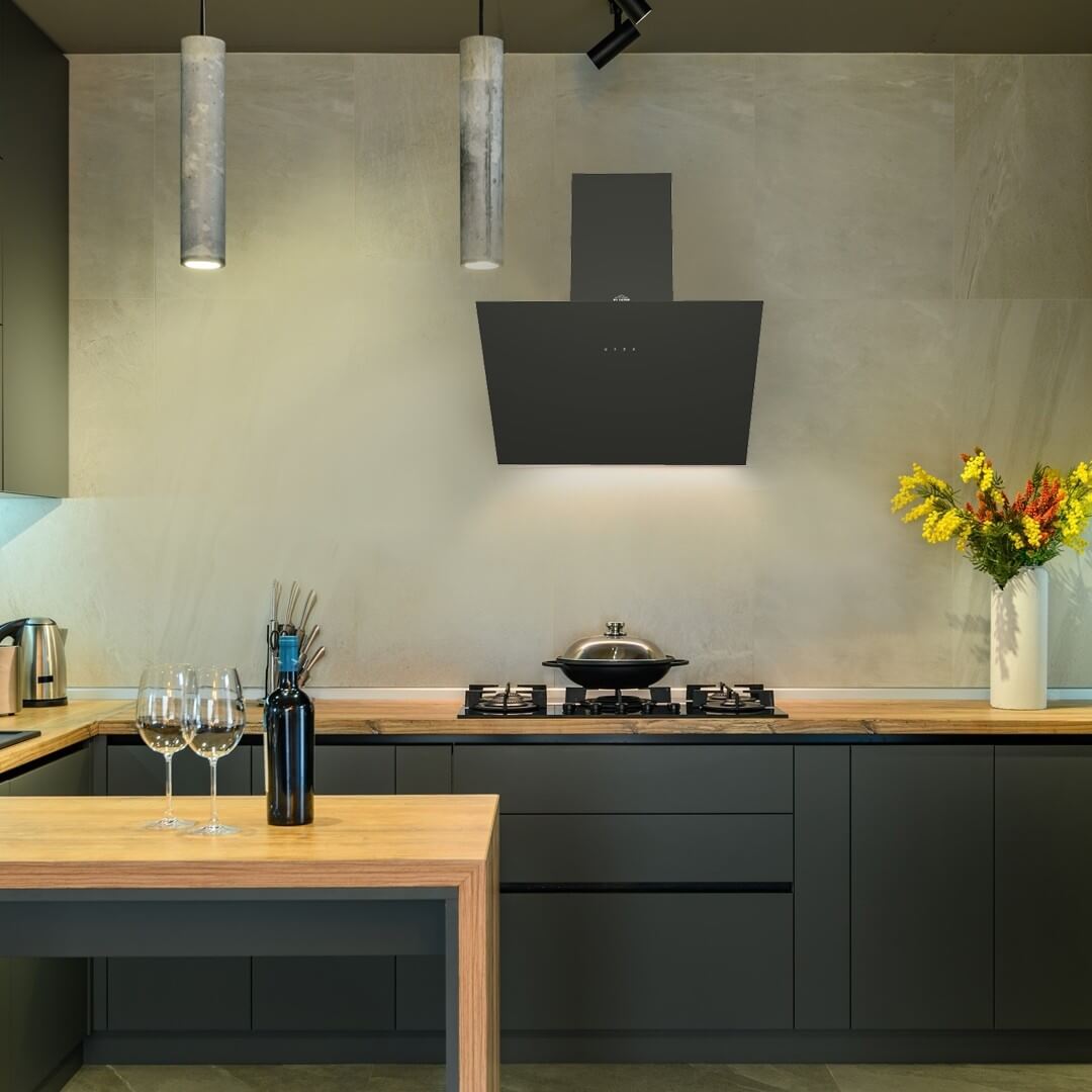 Чёрные наклонные вытяжки — универсальный вариант. Поскольку остальные предметы бытовой техники часто выполнены именно в этом цвете, сочетать их между собой не составит труда.