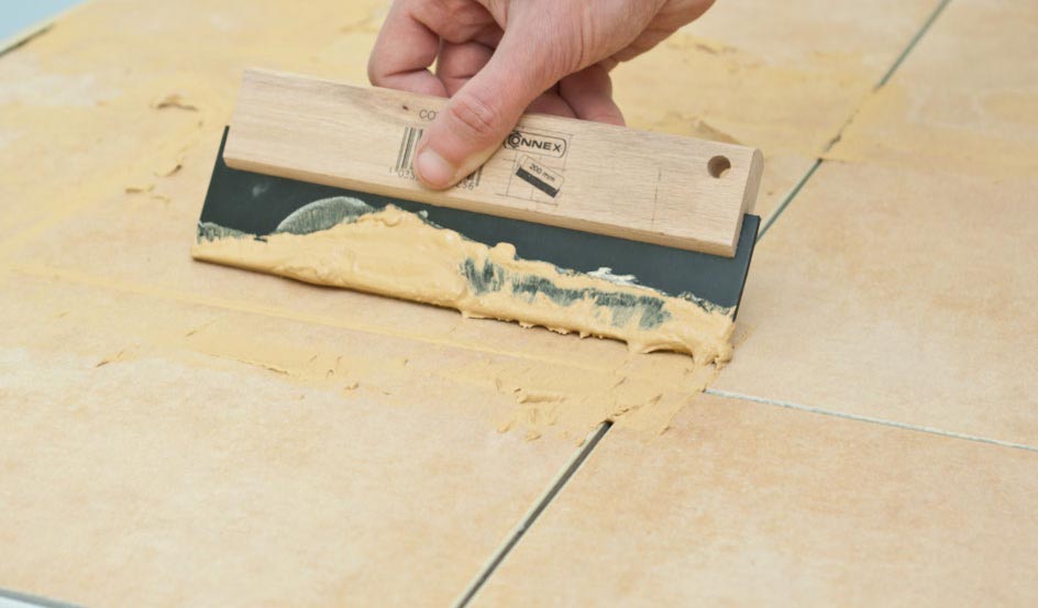 После подготовки поверхности и рабочей массы можно приступать к работе. Резиновым шпателем раствор впихивается между кафелем. Делать это нужно аккуратно, пытаясь по минимуму испачкать поверхность. При недостаточно качественном выполнении укладки кафеля, возможно, образование пустот в углах