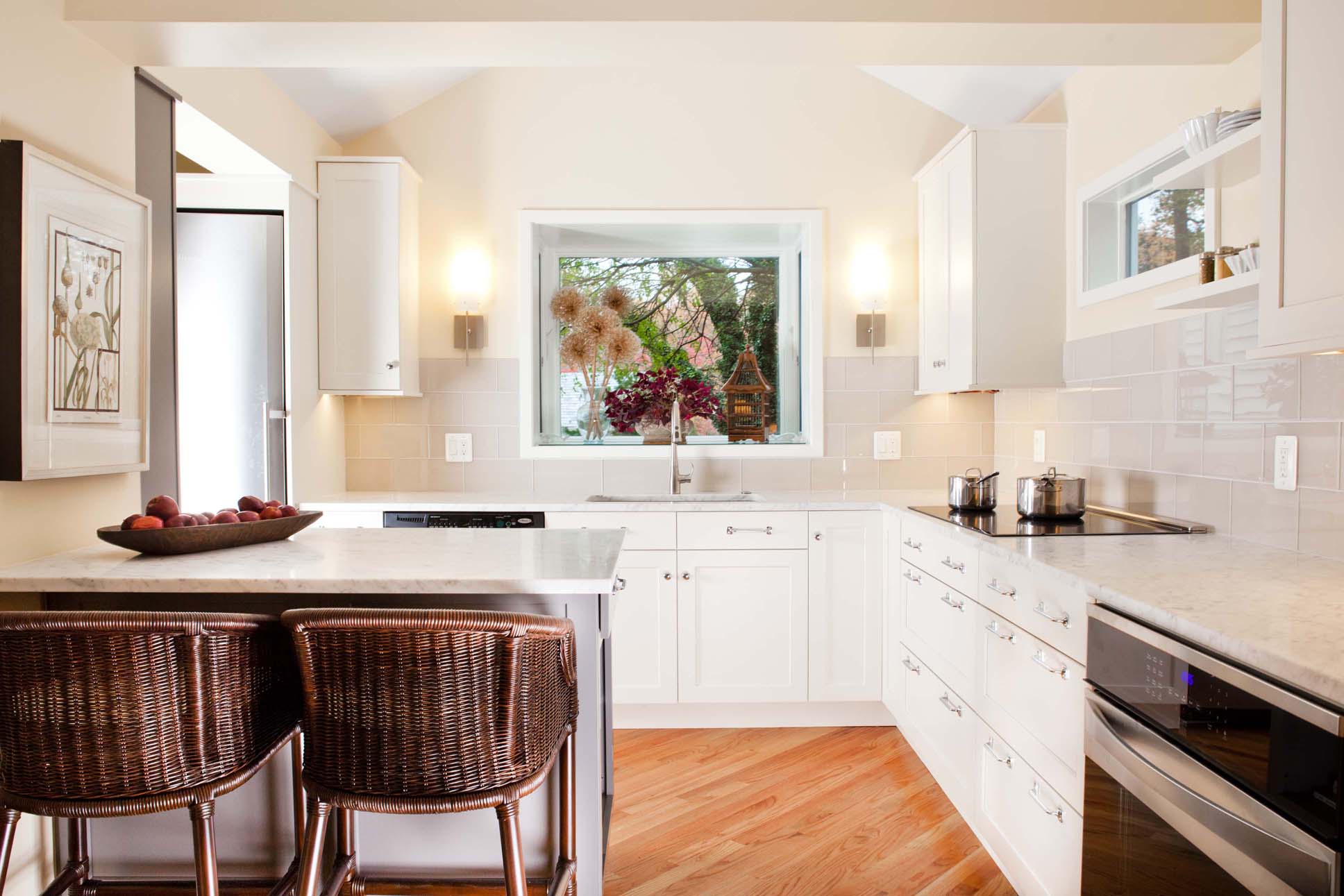 Современная белая кухня со столешницей под мрамор и встроенным холодильникомИсточник www.houzz.ie