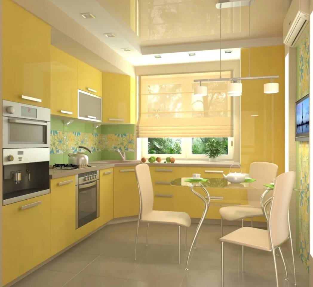 Комбинация желтого и зеленного хорошо смотрится даже на небольших по размеру кухнях.