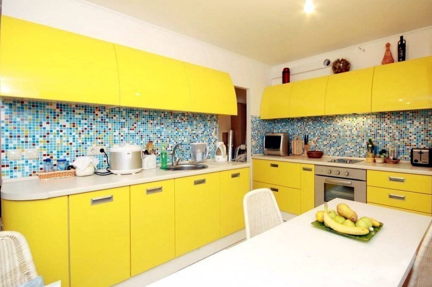 Желтая кухня в интерьере позволяет экспериментировать с любым дизайном шкафов. Если вы уже покрасили кухню в солнечный цвет, то лучше иметь белый кухонный шкаф и островок. Вы также можете добавить некоторые красные акценты.