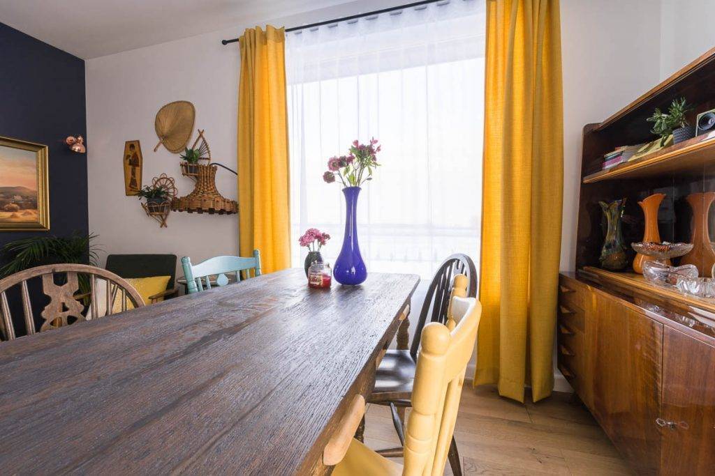 Совет: используйте шторы с разнообразными узорами, они идеально подойдут под желтые обои. Шторы в полоску, с геометрическими рисунками, абстрактными узорами и растительными принтами отлично сочетаются с обоями, даже если в них использованы только вкрапления желтого.