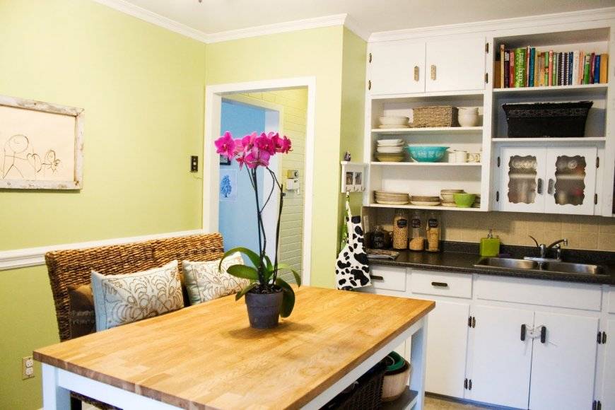 Будет радовать своим интерьером спокойных и уравновешенных людей. В холода или дождливые дни такие цвета будут буквально «согревать» и напоминать о жарком лете. Верх кухни лучше покрасить в желтый, а низ – в зеленый. Именно такому интерьеру подойдет обилие зелени и натуральных цветов на кухне.