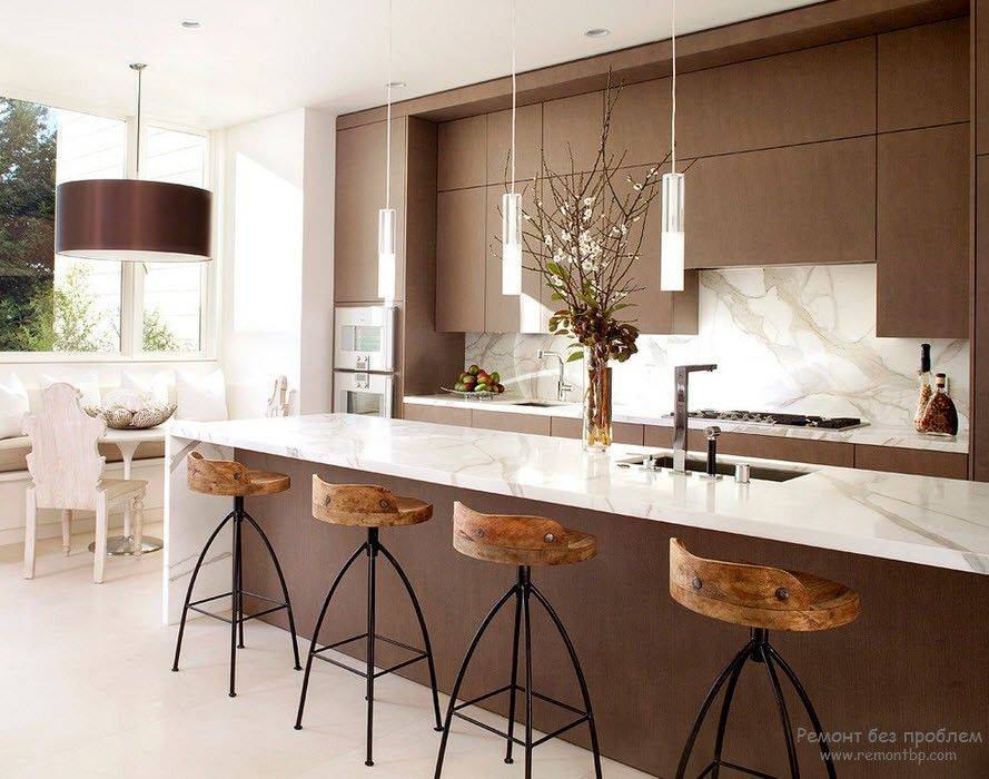 Коричные и желтые цвета на кухне, тоже интересны, но здесь нужно быть очень аккуратным в выборе оттенков, так как эти два цвета олицетворяют вместе как легкие, так и тяжелые тона. Но если правильно и грамотно подобрать оттенки того и другого цвета, то можно быть уверенным, что на вашей кухне будет создана атмосфера комфорта и домашней обстановки.