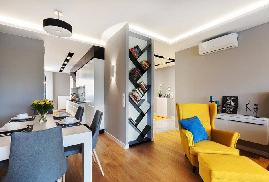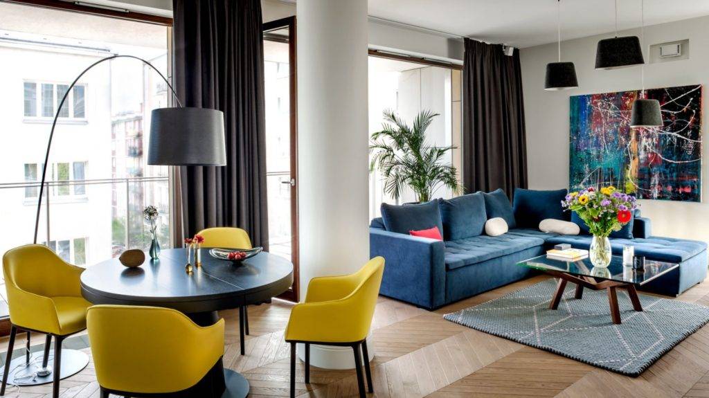 желтый и голубой: очень популярное контрастное сочетание желтого с голубым или синим помогает придать помещению динамичности, необычности и креатива.