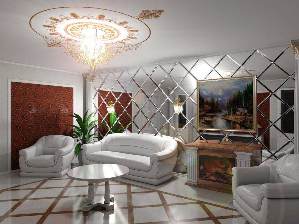 Декоративная зеркальная плитка в гостиной придаст интерьеру элегантный, презентабельный характер. Плитка может украсить стену за диваном, повесить над камином вместо великолепного зеркала (по парижской моде) или подчеркнуть красоту хромированной консоли — тут масса возможностей. Если вы не хотите украшать всю стену плиткой, заполните выбранную область плиткой и закройте ее рамкой из гипса.