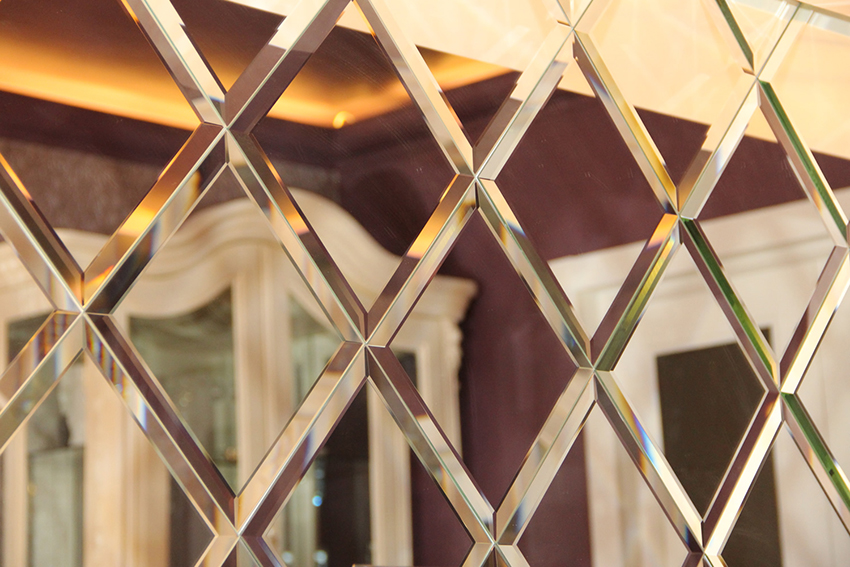 В продаже есть уже готовая плитка, из которой составляется декорация. Но существует небольшая возможность, что грани изразцов не подойдут друг к другу. Поэтому эксперты рекомендуют вырезать элементы из одного большого зеркала и затем затачивать фацеты и полировать.