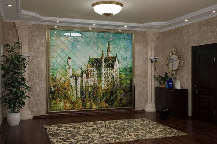 Зато панно сразу превращается в стильное украшение, такую композицию можно сравнить с обычной картиной на стене. Свет, отражающийся от поверхности, просвечивается сквозь слой красок и изображение будто оживает. Зеркальное панно с фотоколлажем придает помещению особую эксклюзивность.