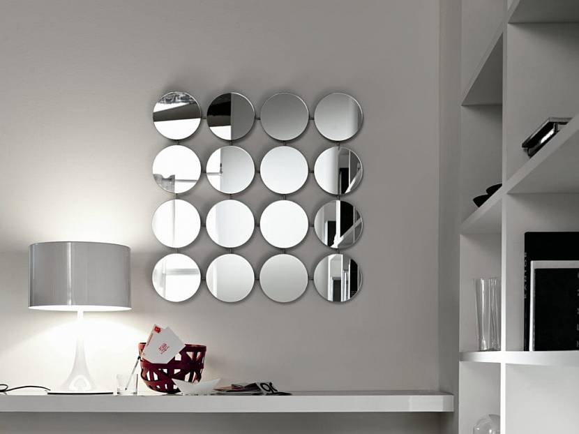 Интересной новинкой стал декор, составленный из круглых или овальных зеркал. Подобная форма гармонично подходит для многих современных направлений дизайна. Расположение элементов может быть хаотичное. Причем используются детали разных диаметров и от этого украшение кажется игривым. Но нередко круглые зеркала участвуют в создании оригинального узора или орнамента.