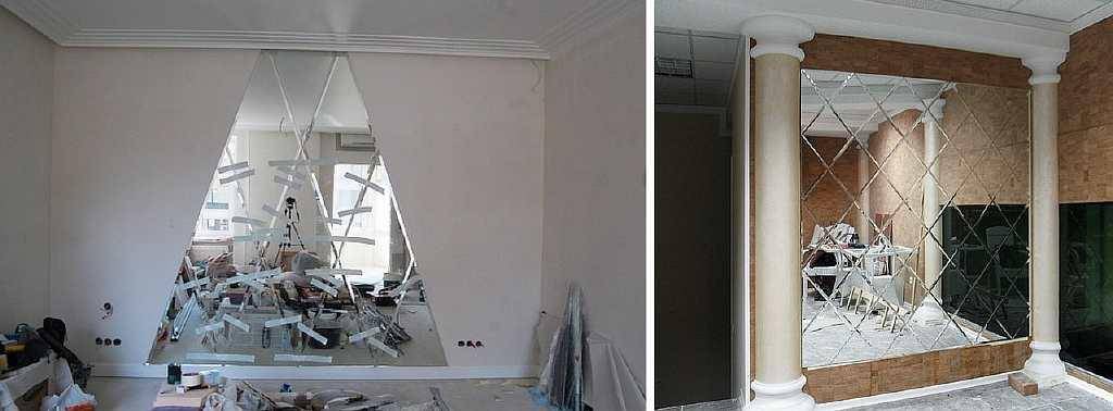 Монтаж зеркального панно на стену в гостиной, прихожей или спальне как на фото, необходимо осуществлять при соблюдении технологических особенностей