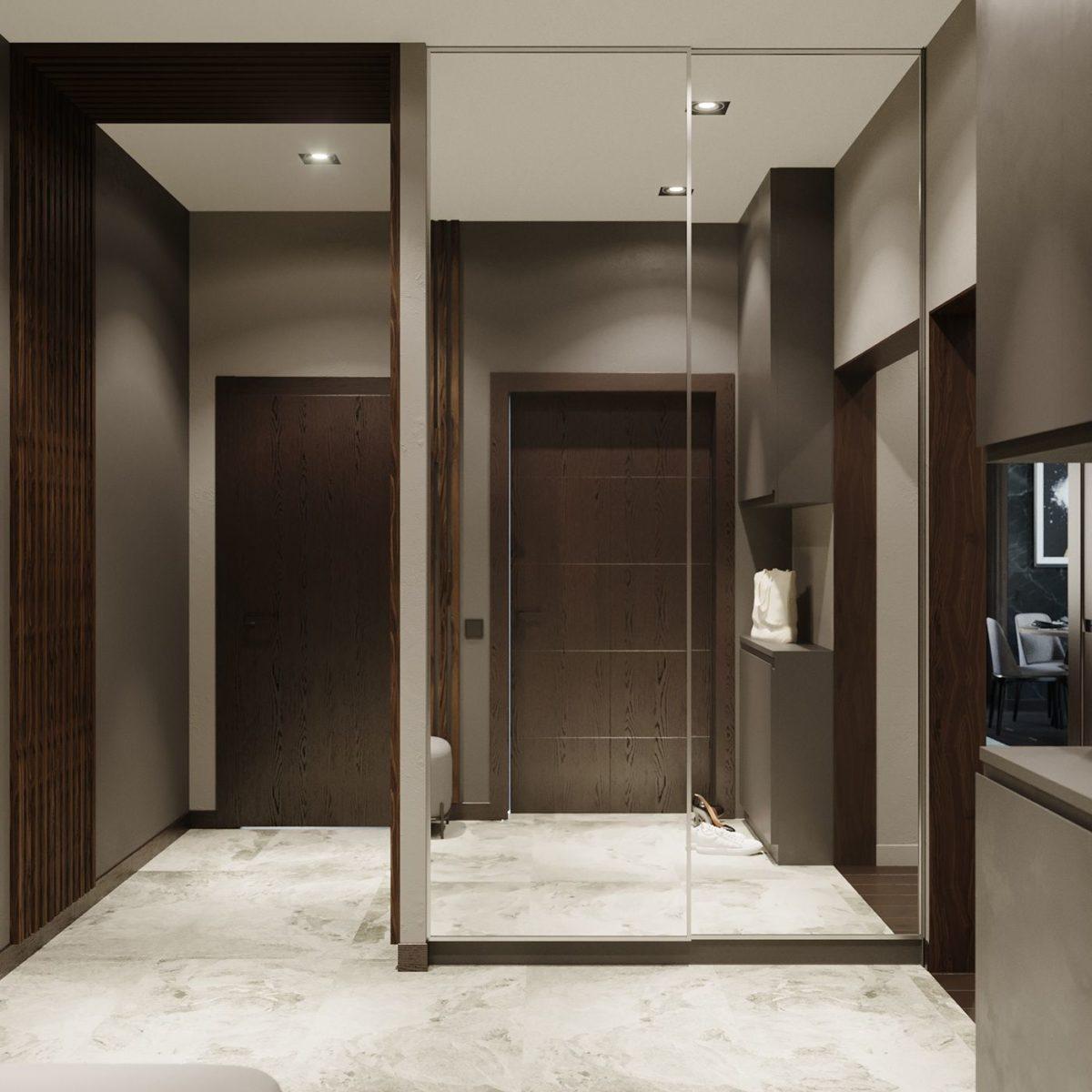 Несмотря на простор, внушительный габариты входной зоны, использование раздвижной системы будет оправдано, это удобно, практично, и очень красиво выглядит