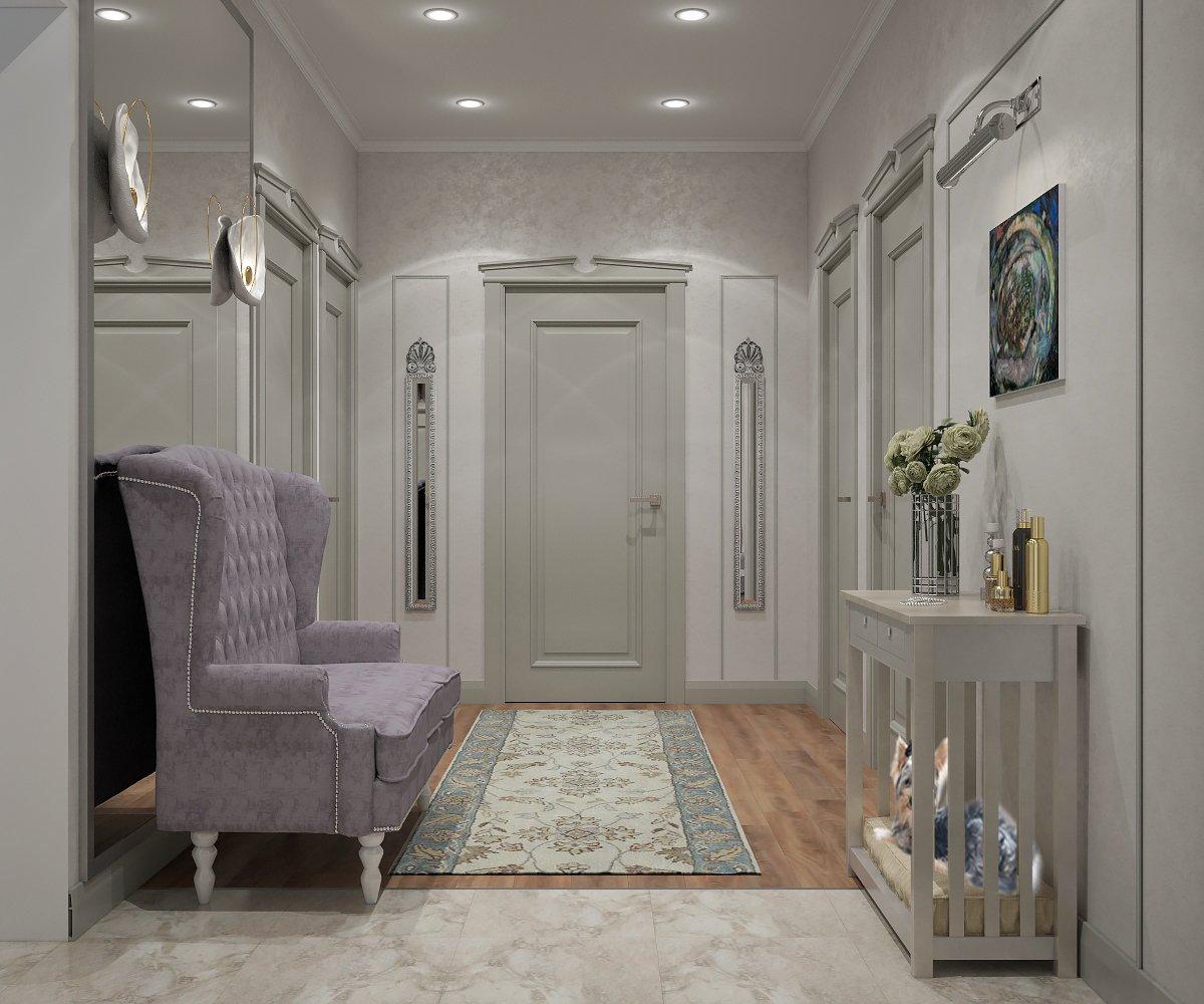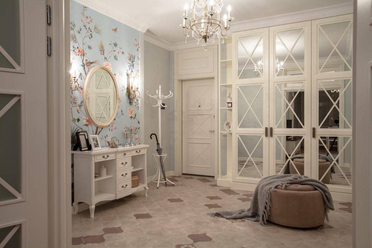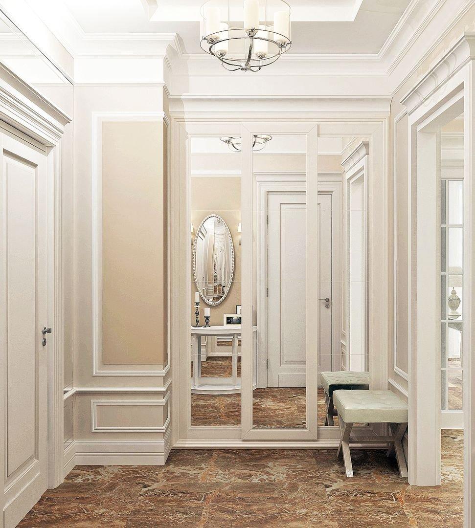 В прихожей, оформленной в неоклассическом варианте, уместно выглядят мебельные изделия с зеркальными фасадами.