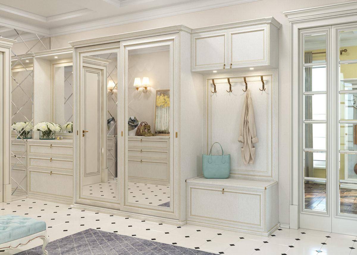 На первом фото конструкция занимает всю стену, но не выглядит при этом громоздкой и не отвлекает на себя главное внимание. Секрет успеха не только в правильно подобранной фактуре для фасада, а именно матовые молочно-белые, ровные оттенки, а и в центральной нише, оформленной в классическом стиле. Благодаря этому появляется отличное место для обувания, и, вместе с тем, комната выглядит очень стильно