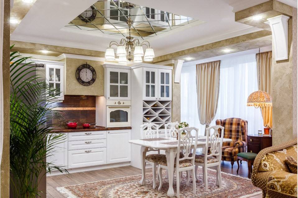 На фото кухня, выполненная в светлых тонах с большим зеркалом в золотистой раме на стене.