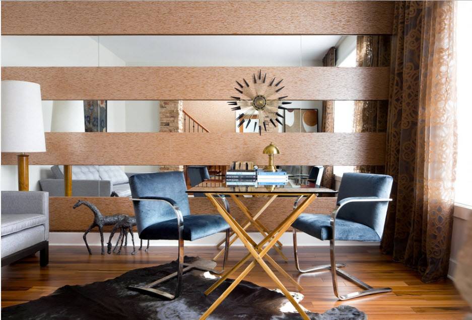 Если комната узкая, маленькая, с присутствием отражающего украшения интерьера визуально будет обеспечено увеличение помещения – в этом заключается основная функция зеркальных поверхностей.