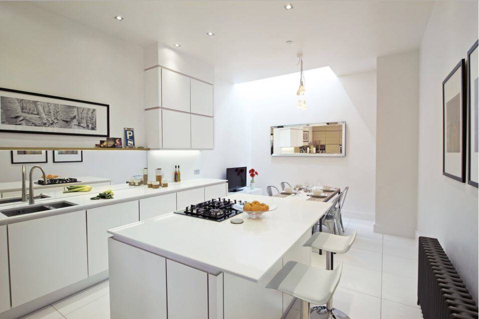 По обеим сторонам для удобства хозяйки равномерно распределяют бытовую технику, шкафчики. Мойку и холодильник можно установить у одной стены, а плиту — у другой. Стол для обеда находится либо в центральной части, либо возле окон, все зависит от размеров кухни.