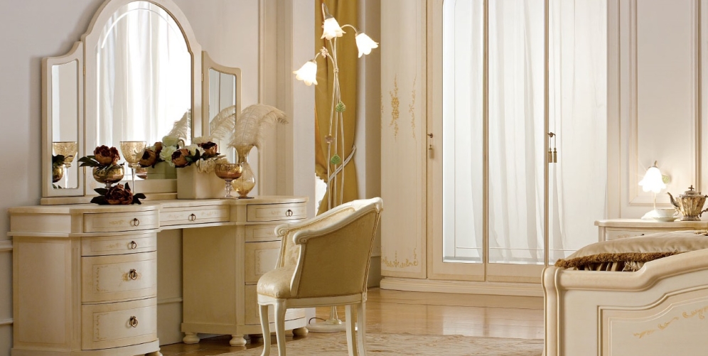 - есть смысл разместить на спальной площади будуарный столик с зеркалом. Его классическое расположение сбоку, а не напротив места для сна придаст помещению винтажные интонации. Вместо столика, можно поставить комод с зеркалом. Тогда увеличивается место для сохранения вещей, которые требуется иметь под рукой;