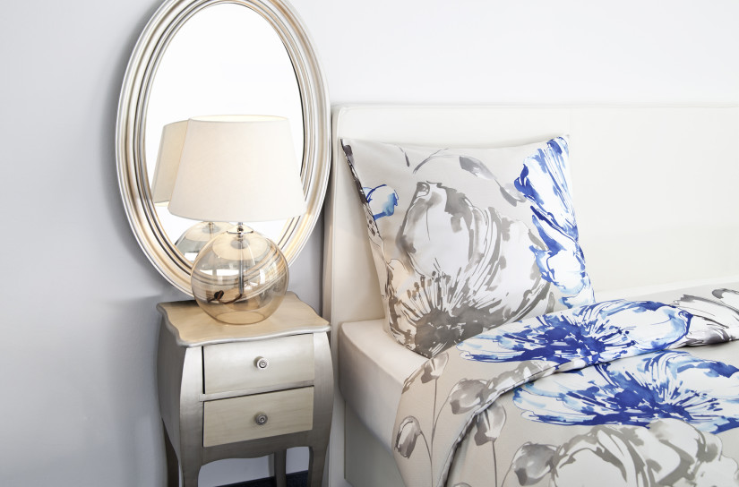 Если прикроватные столики (тумбочки) в вашей спальне относятся к разным стилям, — объедините их с помощью одинаковых зеркал, установленных на стене. Если тумбочки разной высоты, — подвесьте зеркала на одинаковой высоте от пола, чтобы впечатление было действительно гармоничным.