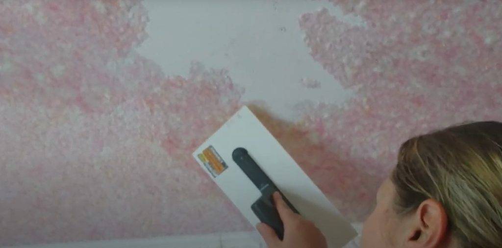 Учтите, что в случае нанесения такой декоративной штукатурки на потолок пульверизатором в один слой, в некоторых местах материал может сползти.