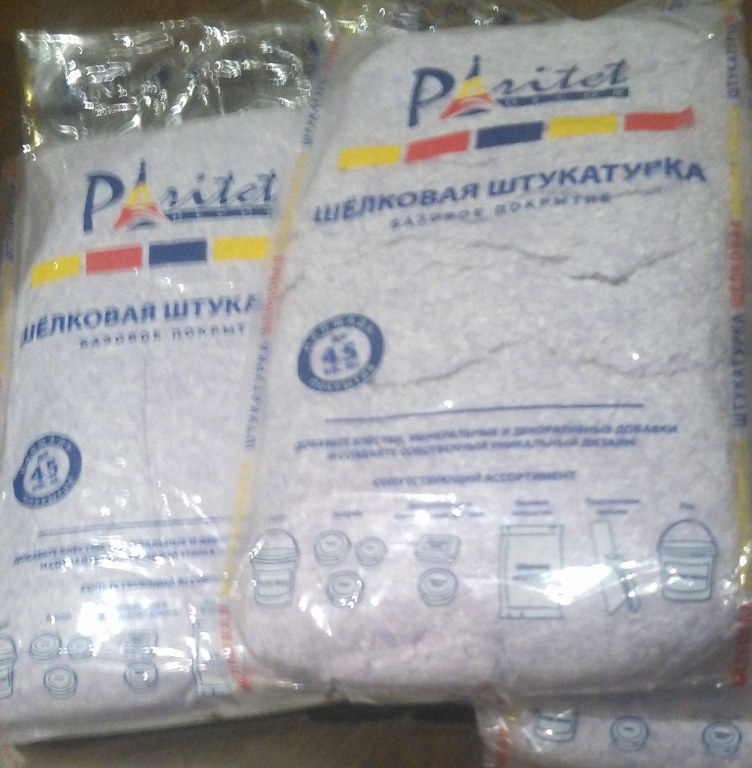 Материал в своем первоначальном виде является сухой и сыпучей смесью. Эта субстанция продается в пакетах из пластика. На первом этапе сухая смесь замешивается с добавлением воды и настаивается необходимое количество времени. Только после этого штукатурку можно наносить на стены.