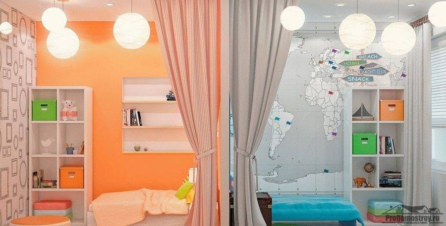 Если Вы выбрали способ деления посредством штор, обратите внимание на потолок, на лампы, розетки, чтобы равномерно их распределить. Поклейте контрастные обои и обзаведитесь двусторонними шторами, которые усилят зрительное разделение