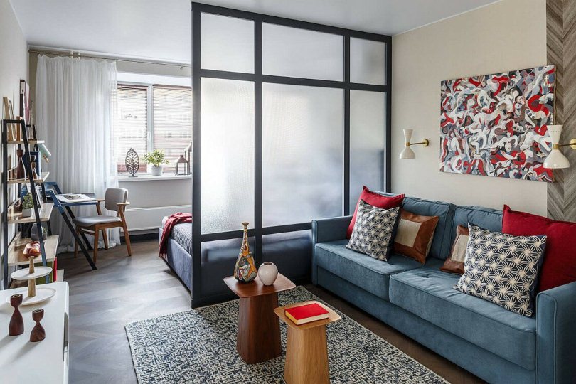 Матовое полупрозрачное стекло в качестве перегородки не препятствует проникновению естественного света в гостиную, что особенно важно, если спальня расположена у окна. Стекло, используемое для перегородок, закалённое и прочное