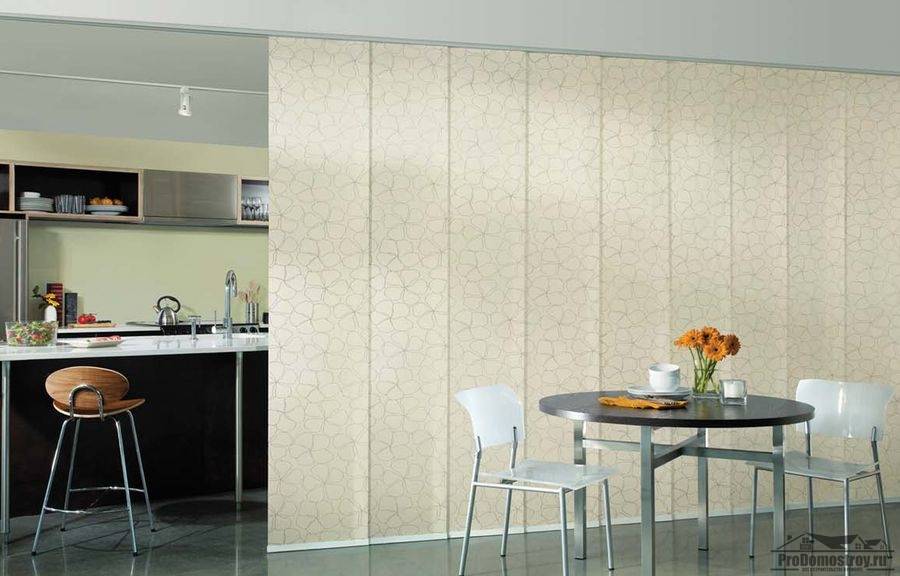 В кухне применяют прием зонирования полотнами. Здесь отделяют обеденную область от рабочей части. Используют плотные материалы, жалюзи и т.д.