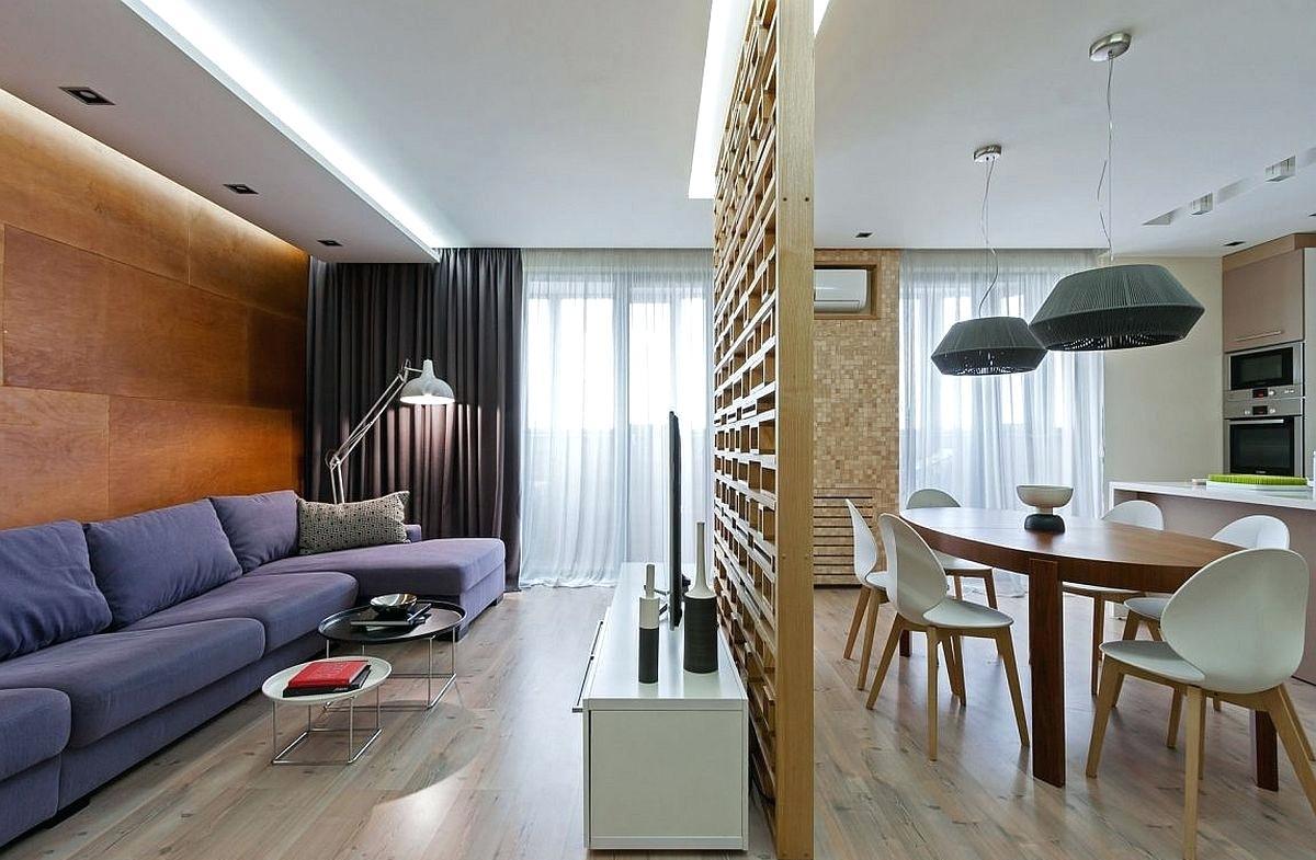 Зонирование гостиной, кухни и столовой с помощью мобильных конструкций появилось не так давно. Для изготовления таких стен применяют дерево, пластик и даже текстиль.
