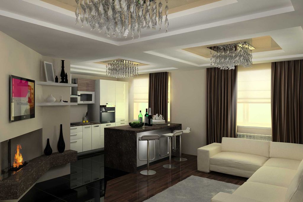 Что еще немаловажно, что в большом помещении можно реализовать намного более оригинальные идеи по оформлению: интерьер кухни совмещенной с гостиной однозначно намного интереснее двух отдельно взятых комнат. Тут появляется возможность поиграть со уровнями потолка и пола, с цветом и светом, комбинировать материалы и сочетать стили