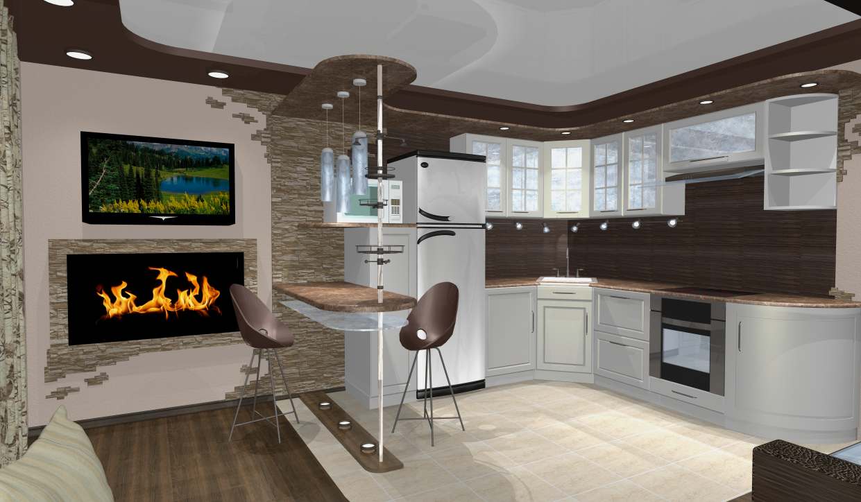 - нет необходимости в приобретении еще одного телевизора для кухни. Обзор будет достаточным из зоны отдыха. Если правильно расположить плазму.